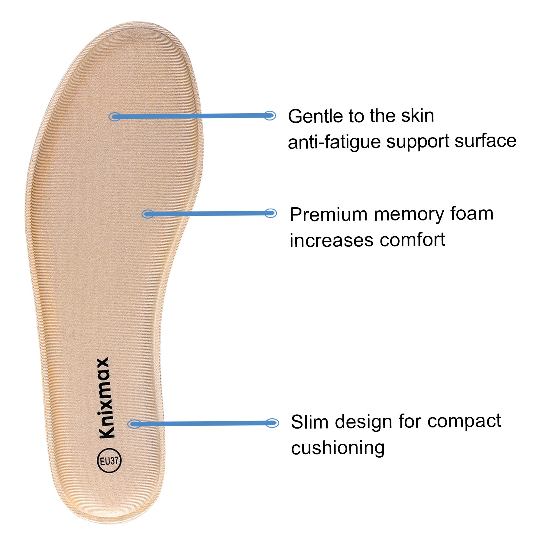 Knixmax memory foam insoles will slowly conform to the shape of your foot, evenly distributes pressure while standing, walking and running.